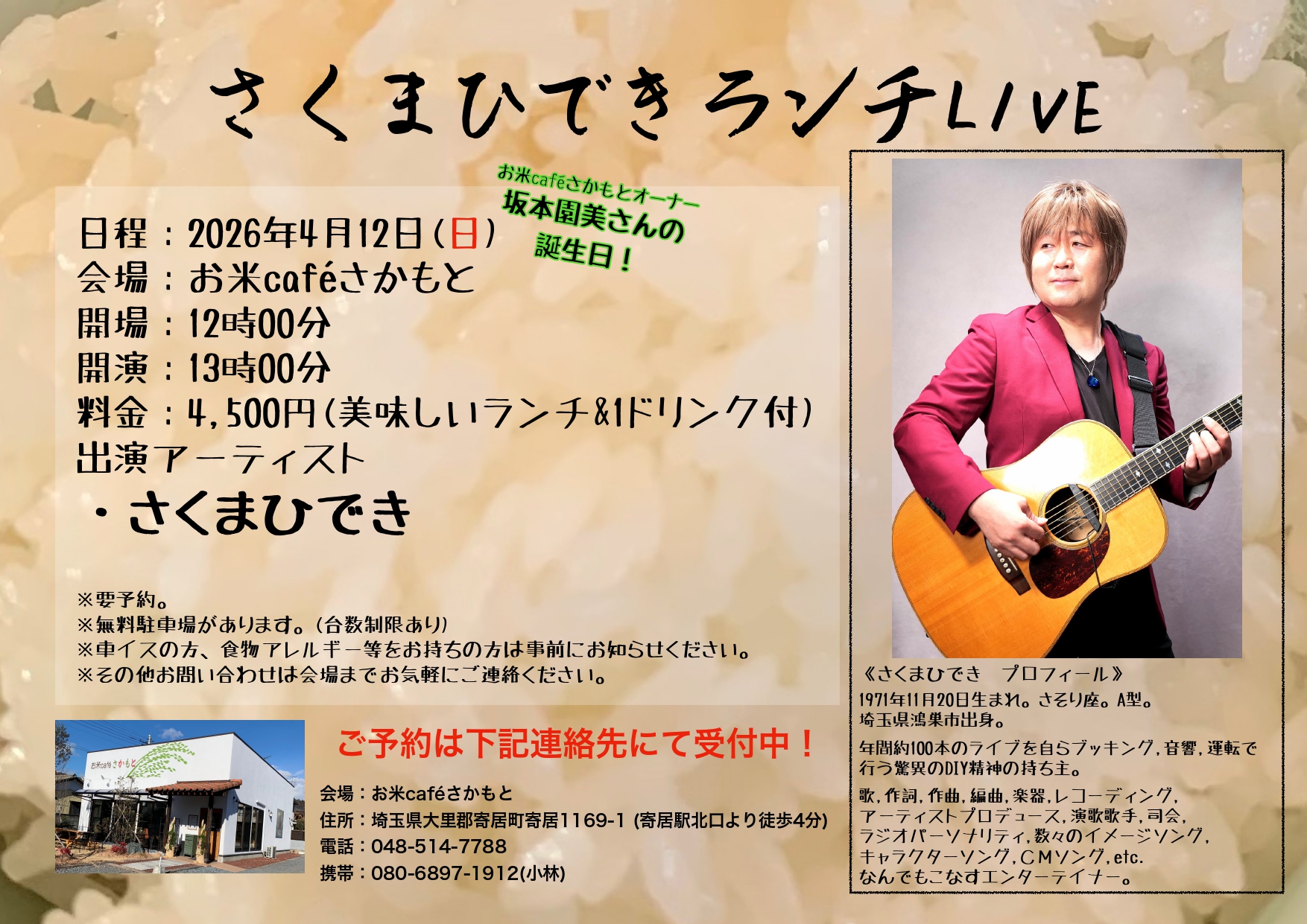 ★4/12(日)お米cafeさかもと 「さくまひできランチLIVE」(埼玉)※要予約